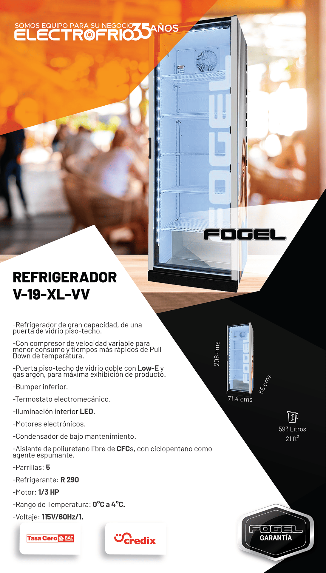 • Puerta piso-techo de vidrio doble con Low-E y gas argón, para máxima exhibición de producto.